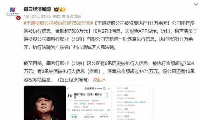 刺痛公众的,显然不是数字本身,而是信用被摁在了放大镜下 这笔钱并非于谦的个人债务,源头在他持股10%的墨客行影业 公司2019年成立,注册资本5000万,业务没跑顺,后续债务像滚雪球 到今年10月27日,法院发布恢复执行信息,墨客行影业名下已有6条历史被执行人信息,被执行金额累计超7554万,3条失信信息涉案超1471万,股权冻结多达15条 法定代表人赵仁鹏自2022年11月起多次被限高,相关涉案金额累计超过3316万元,这是一家问题缠身的公司 这不是“没钱”的故事,而是“怎么面对债务”的故事 有相关人员解释,于谦是因为“出资款缴付期未到”才被牵连,并非恶意拖欠
